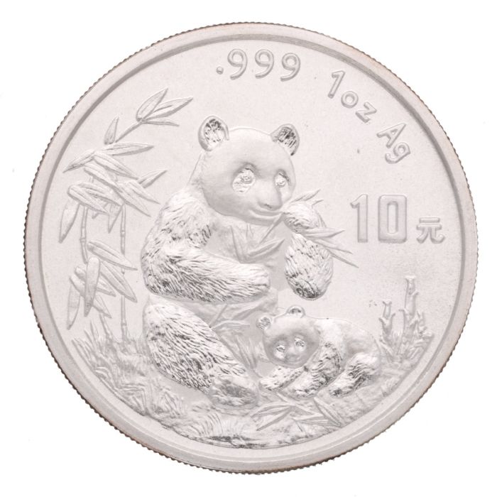 Revers: wechselnde Darstellungen eines oder mehrerer Pandas: hier Pandamutter mit Kind im Gras mit Bambus sowie Angabe des Feingehalts und Feingewichts und des Nennwertes.