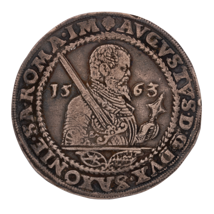 Revers: Brustbild nach rechts des Kurfürsten mit Kurschwert und Streitkolben. Umschrift „AUGUSTUS D:G DVX SAXONIE SA ROMA IMP(erator) (August von Gottes Gnaden Herzog von Sachsen Heiliges Römisches Reich)