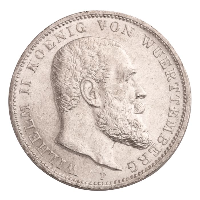 Avers: Portrait Wilhelm nach rechts, Umschrift: WILHELM II KOENIG VON WUERTEMBRG, Prägeanstalt unter dem Portrait