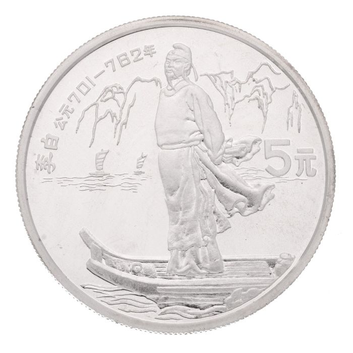 Revers: Darstellung des Li Bai, einer der berühmtesten Dichter Chinas und bekannt für seine melancholisch-romantische Lyrik. Als Erinnerung an herausragende Persönlichkeiten der chinesischen Zeitgeschichte, wird er stehend auf einem Boot gezeigt. Seine Prosa wird noch heute in China gelesen, da sein Stil – eine Mischung aus Romantik und Frohsinn – der Mentalität der Chinesen sehr entgegenkommt.