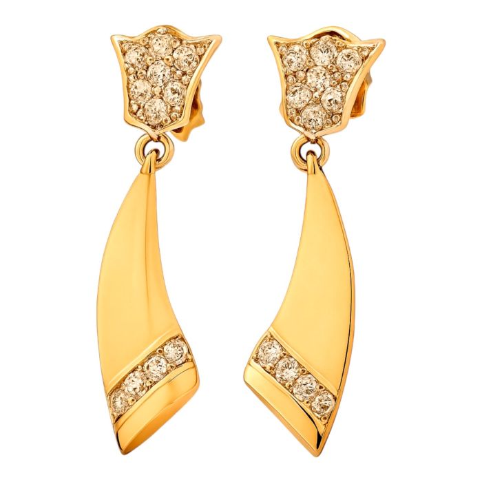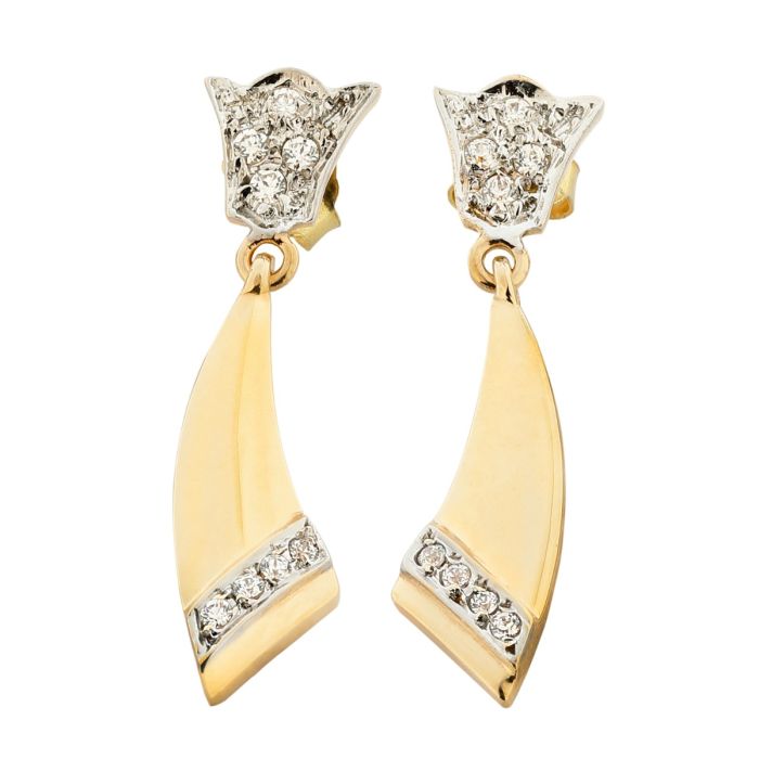 Paar Ohrstecker mit Anhängern. Kopfteil in stilisierter Tulpenform rhodiniert besetzt mit vier Zirkonia, Anhänger in geschwungener Dreieckform am unteren Rand in rhodiniertem Band besetzt mit 4 Zirkonia.