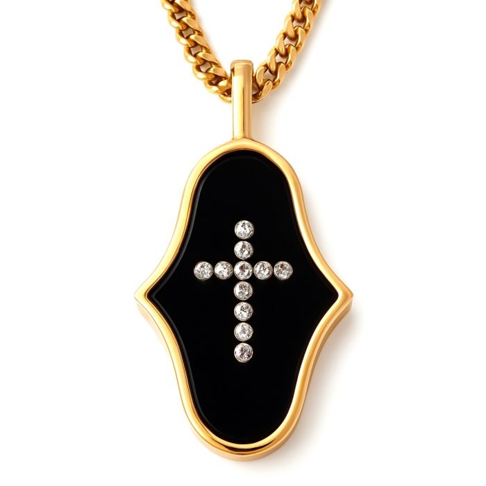 Der Anhänger hat einen goldgefassten Onyxstein von einer Seite und auf der anderen Seite eine Kunststoffhülle auf der von innen ein Kreuz aus Zirkonia geklebt ist.