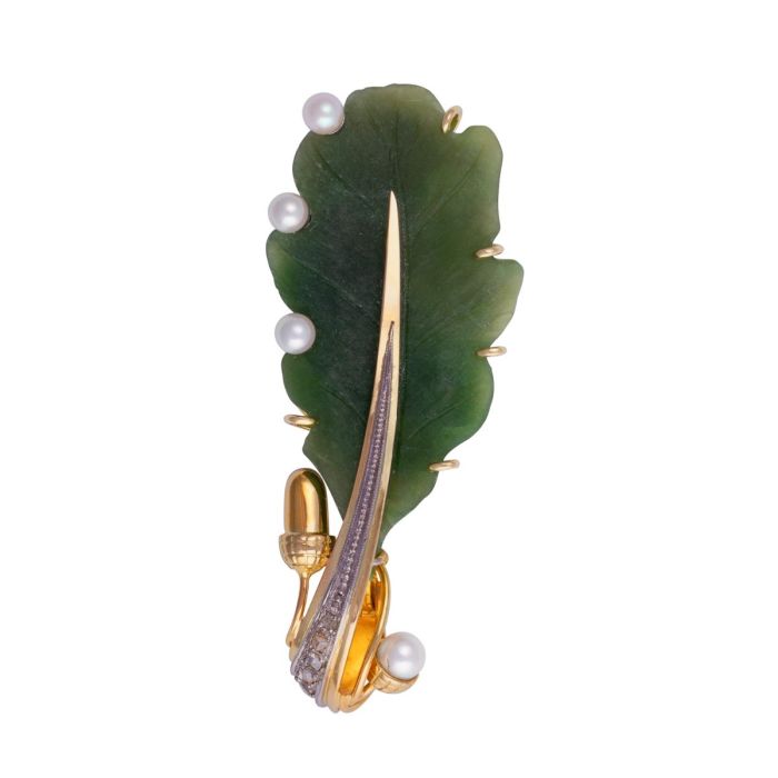Das dargestellte Eichenblatt ist aus grünem Achat gearbeitet. Der darüber gezogene Stiel ist mit 5 Diamantrosen auf einem weißgoldenen Grund versehen.