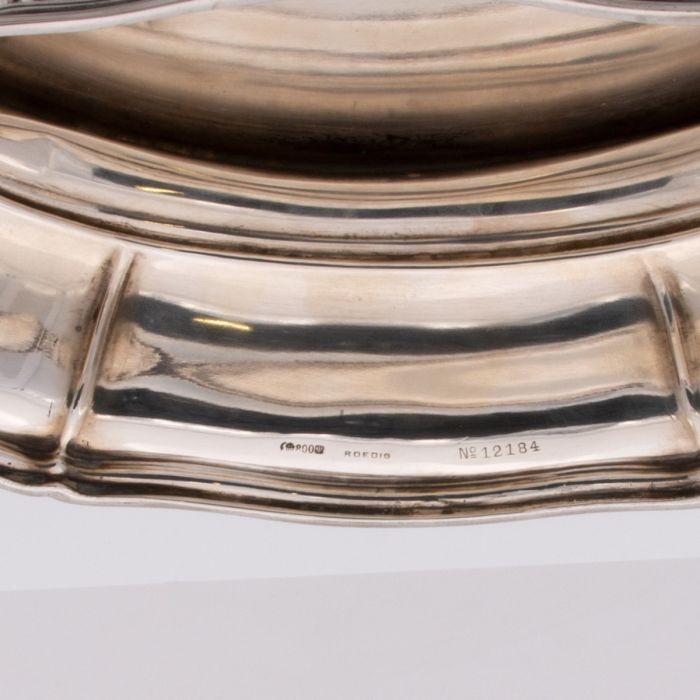 Die Fußschale ist gepunzt mit Garantie- und Feingehaltsstempel, Herstellermarke und Name des Juweliers ROEDIG sowie der Modellnummer 12184.