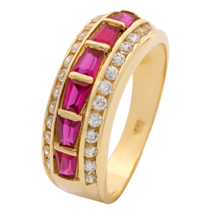Schauseitig ist er mit 6 Rubin Imitationen in Trapezschliff mittig bestückt. Flankiert werden diese von je 13 funkelnden Zirkonia.