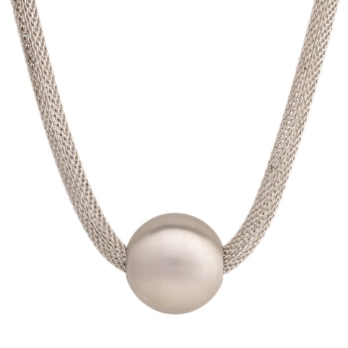 Die vollrunde 12 mm starke Strickkette hat mattierte fest zusammengefügte Abschlusskappen. Als Blickfang dient ein bewegliches satiniertes Kugelelement von ca. 4 cm im Durchmesser.