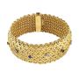 Mittig alternierend besetzt mit 6 runden Saphiren in vierteiliger Krappenfassung und 6 Brillanten von zus. ca. 0,18 ct. (W, IF-VVSi) in quadratischer Rahmenfassung.