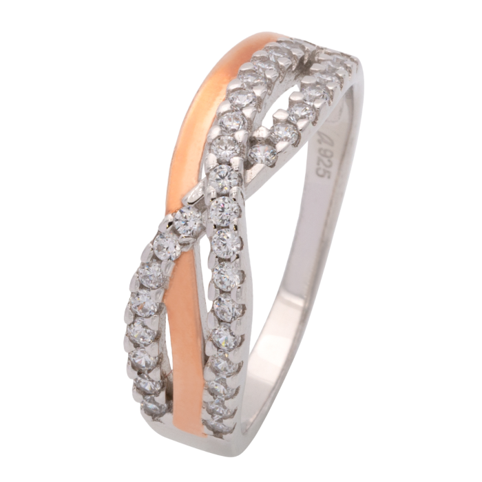 Der schöne Ring teilt sich schauseitig in drei überkreuzte Bänder, mit einem rotvergoldeten hochglanzpolierten Band und zwei zirkoniabesetzten Bändern mit Pavéefassungen.