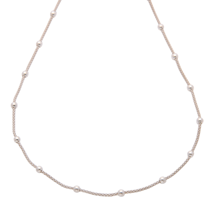 Das zarte Collier besteht aus einer Kette in Himbeermuster mit in regelmäßgen Abständen zwischengesetzten glänzenden Kugeln.