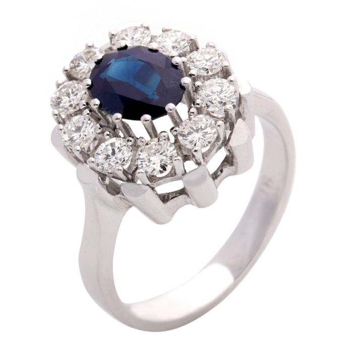 Der 9 mm hohe Ringkopf ist oval. Das Zentrum dominiert ein Saphir in Ovalschliff von ca. 1,0 ct. Entouriert wird er von 10 Brillanten von zusammen ca. 0,90 ct. (W, IF-VVS1). Zwischen den Brillanten sitzen außen und etwas tiefer angebracht halbrunde glänzend polierte Scheiben, die in Aufsicht die Ansicht einer Blüte ergeben.