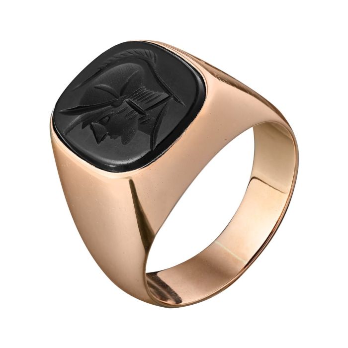 Massive Ringschiene in edlem Rotgold schauseitig pyramidal gearbeitet für eine eingefasste Onyxplatte mit Intaglio „Kopf eines antiken Kriegers, vielleicht Symbol für den griech. Kriegsgott Ares“.