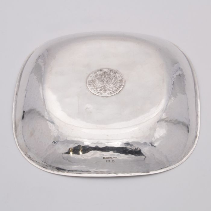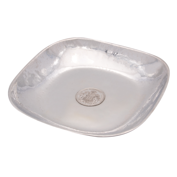 Die Schale in quadratischer Grundform hat gerundete Ecken und Hammerschlagdekor sowie einen schmalen 2mm breiten Rand.