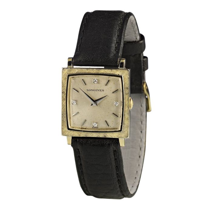 Seltene Armbanduhr/Herrenuhr um 1930, Uhrwerk von Longines in Gehäuse der Manufaktur Kasper & Esh Inc. New York USA (gegr. 1926), viereckiges Gehäuse mit fein graviertem Schraffurdekor und silberfarbenem Zifferblatt mit silbernen Strichen und 4 Diamanten als Indizes.