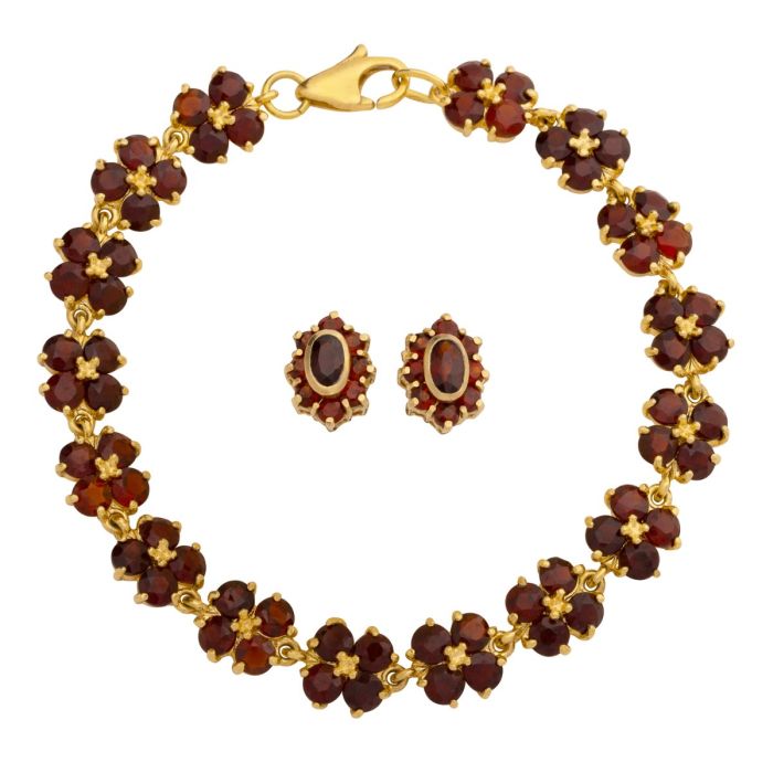Set – Armband, Anhänger mit Kette, Ohrstecker besetzt mit Granatsteinen