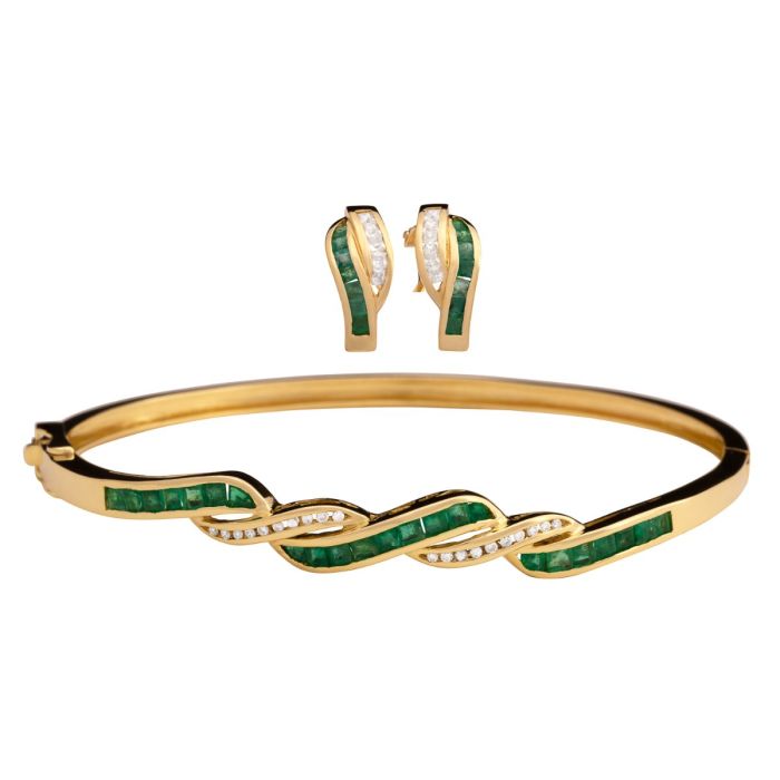 Set- Armreif und Ohrringe mit Smaragden, Brillanten und Zirkonia
