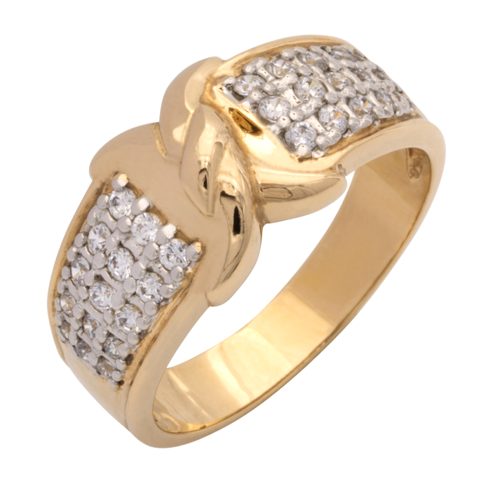 Schauseitig funkeln 30 Zirkonia den Betrachter entgegen. Mittig ziert eine Art gedrehtes Band, ebenfalls vergoldet, den Ring.