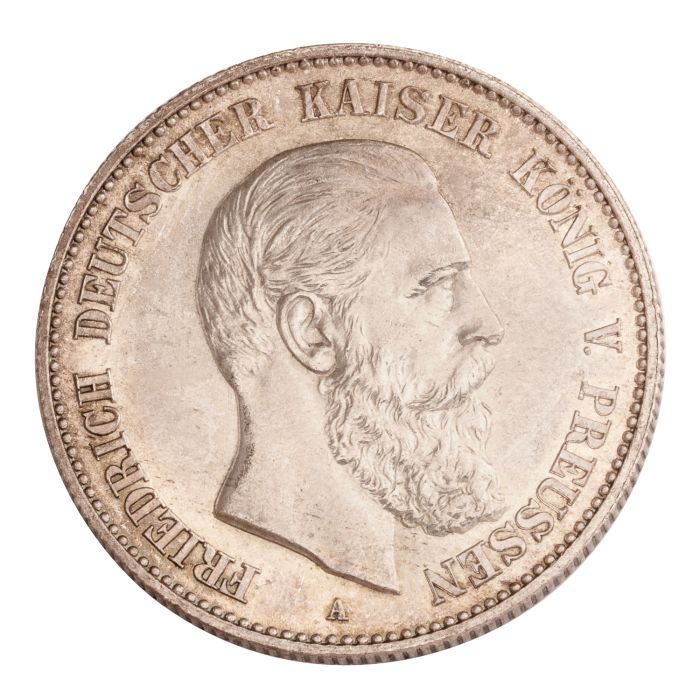Preußens König war gleichzeitig Kaiser des Deutschen Reiches. Diese Münze wurde erst nach dem Tode von Friedrich III., König von Preußen, Kaiser des Deutschen Reiches, geprägt. Der liberal gesinnte Friedrich III. (geb. 18. Oktober 1831, gest. 15. Juni 1888) war zum Zeitpunkt des Regierungsantritts im März 1888 bereits todkrank, er hatte Kehlkopfkrebs und konnte somit nicht sprechen. Aufgrund seiner kurzen Amtszeit wird er auch als der 99-Tage-Kaiser bezeichnet. Seine Witwe Victoria, die älteste Tochter der englischen Queen Victoria, nahm aus Trauer den Namen 'Kaiserin Friedrich' an.