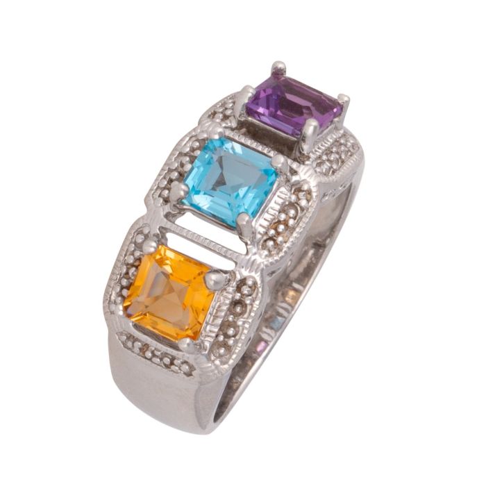 Schauseitig sind 3 farbige Steine jeweils in Krappenfassungen gesetzt.