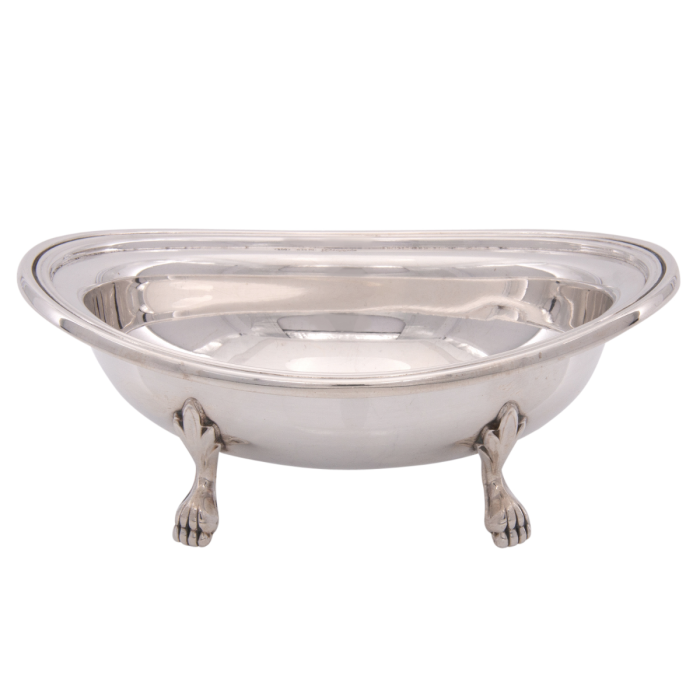 Das kleine ovale Schälchen mit vier angesetzten Tatzenfüßen hat einen elegant gebauchten Korpus mit einem abgesetzten geraden und auf der Oberseite profilierten Rand.