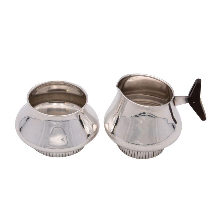 Das schöne Rahmset bestehend aus Zuckerschale und Sahnegießer stammt aus der Silberwarenfabrik Lutz & Weiss in Pforzheim.
