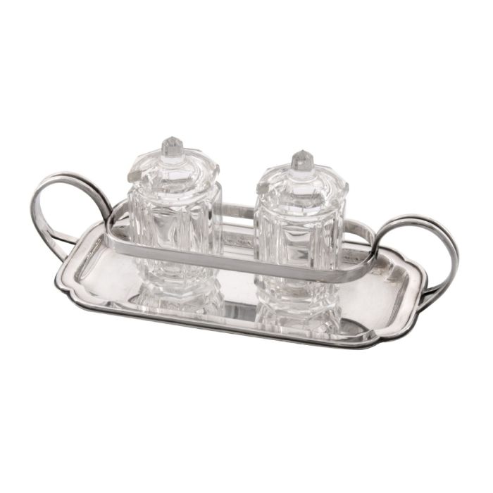 Dazu gehören zwei Deckeltöpfchen aus Glas für Gewürze oder Senf, die hineingestellt werden können. Diese sind achteckig und tragen einen Kerbschnitt-Dekor.