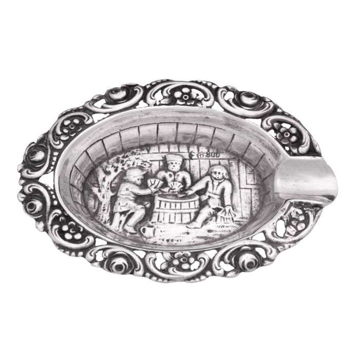 Er hat einen à-jour gearbeiteten Rand mit reliefiertem Blumen und C-Spangen-Dekor und eine reliefierte Genreszene im niederländischen Barockstil im Spiegel. Sie zeigt drei Kartenspieler im oder vor dem Wirtshaus.
