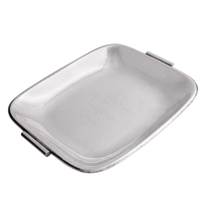 Ihre Wirkung erzielt sie durch ihre gerundete Rechteckform mit Hammerschlag-Dekor und der schwach gebauchten Wandung. Seitlich am einfach umgeschlagenen Rand sind Rundstäbe als Griffe angebracht.