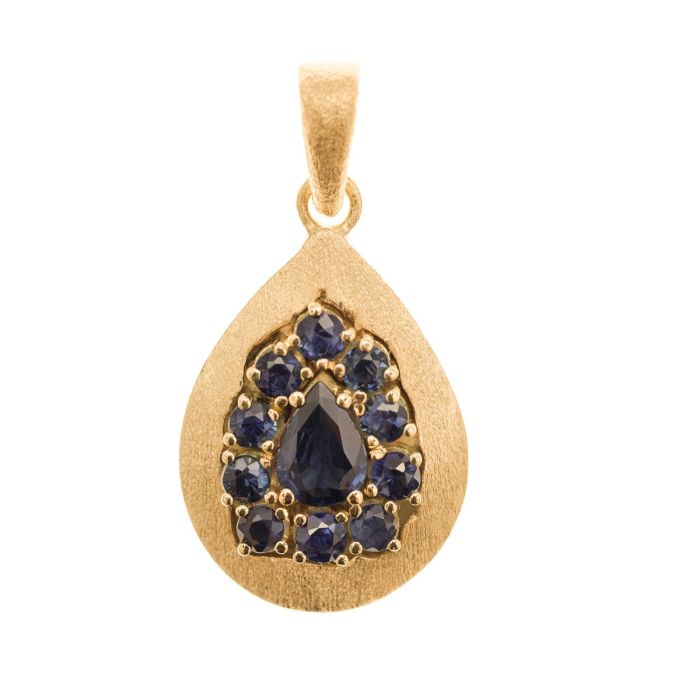 Spitzovaler Anhänger, wohl um 1960/70, rückseitig hochglanzpoliert, schauseitig matt strukturiert und besetzt mit 1 Saphir in Tropfenschliff, entouriert von 10 Saphiren in facettiertem Rundschliff.