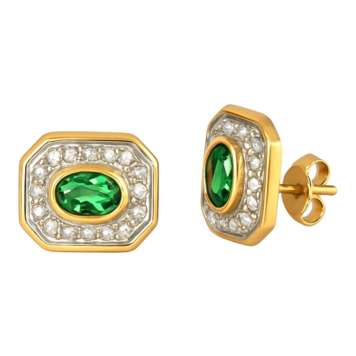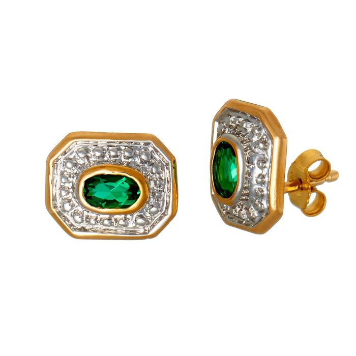 Die Schaustücke sind 8-eckig und haben mittig in einer ovalen Zargenfassung jeweils eine Smaragd-Imitation gefasst.