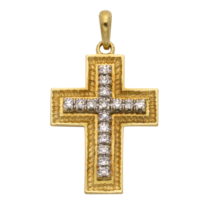 Der Kreuzanhänger, aus 18 karätigem Gold, hat ein schönes ziseliertes Dekor.