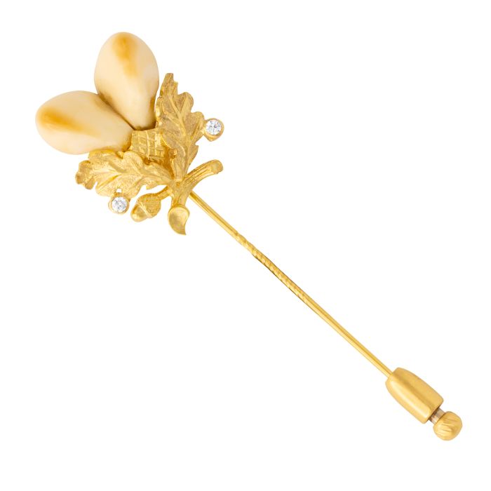 Das Schmuckstück hat aus Gold gearbeitete Eichenblätter sowie die Kapsel der Eichel.