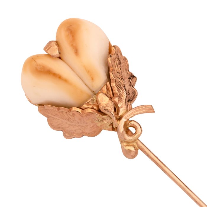 Das Schmuckstück fasst ein Grandelpaar am Schaustück. Umgeben ist dieses von Eichenlaub, das in Rotgold gearbeitet ist.