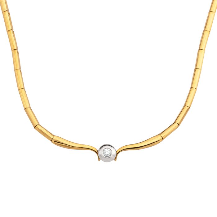 Die Glieder des Schmuckstückes sind stabförmig, in hochglanzpoliertem Gelbgold eng aneinandergereiht.