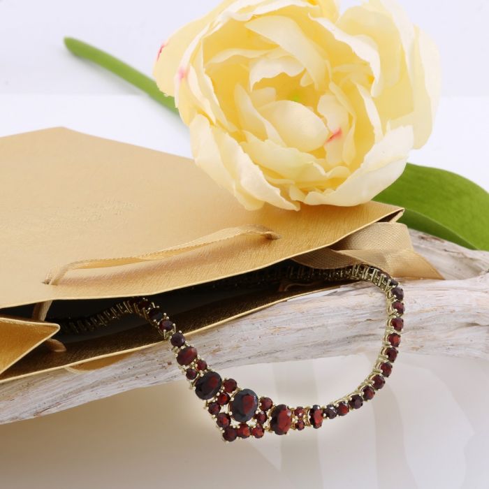 Das elegante Collier in 8-karätigem Gelbgold fasst insgesamt 104 Granatsteine, welche das komplette Collier zieren.
