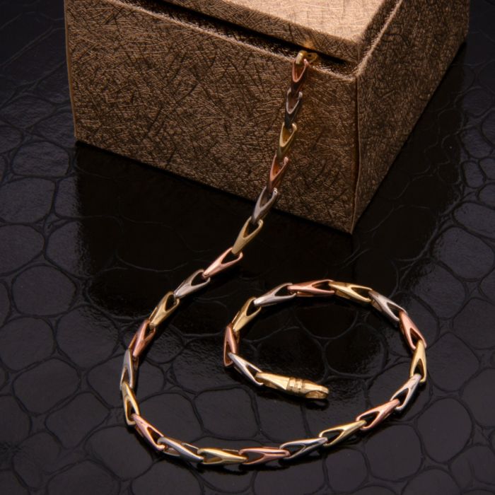 Die hochglanzpolierte Haferkorngliederung hat abwechselnd weißgoldene, rotgoldene und gelbgoldene Glieder.