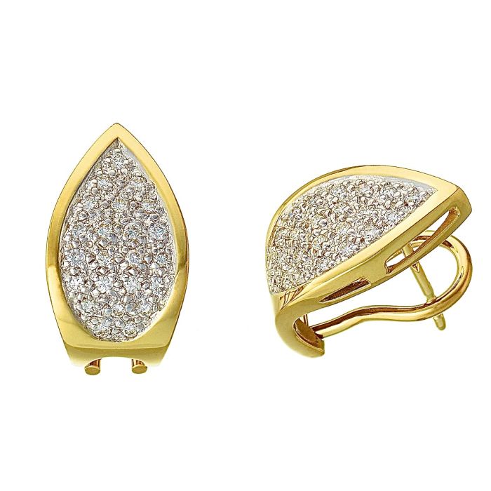 Gelbgold gerahmt sind mittig der Schmuckstücke auf einem weißgolden gearbeiteten Untergrund jeweils 23 Brillanten von je 0,02 ct gefasst.