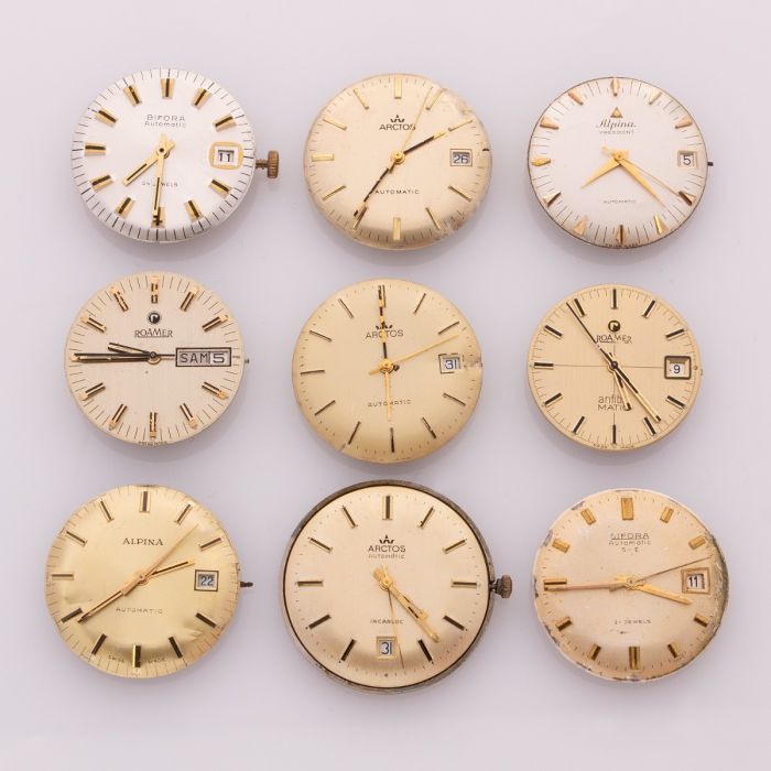 9 Automatik-Uhrwerke für Herrenuhren mit Datum 1960er/70er Jahre