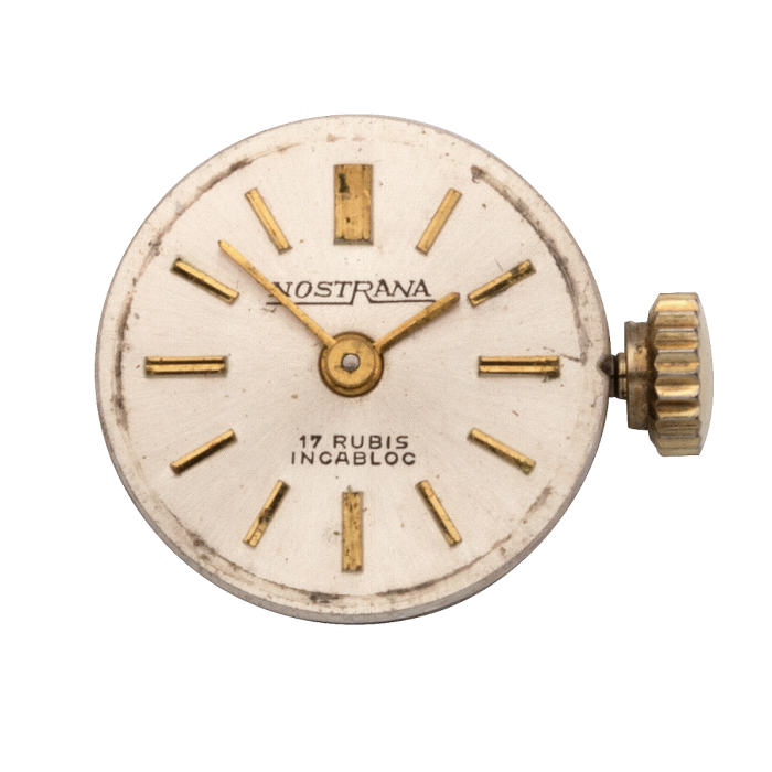Das silberfarbene Metall-Zifferblatt ist bezeichnet mit NOSTRANA und 17 RUBIS INCABLOC. Goldfarbene Strich-Indizes sind appliziert passend zu den ebenfalls goldenen Stabzeigern.