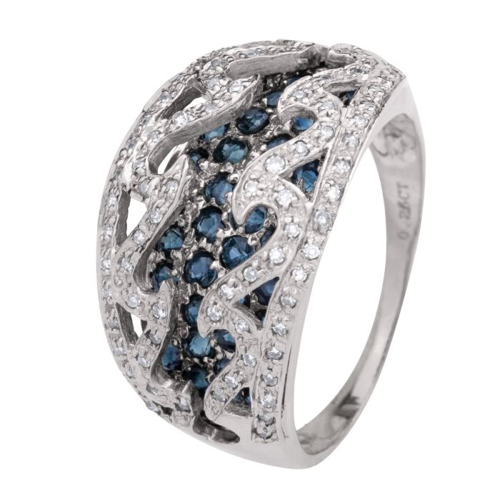 Schauseitig teilt sich der 14 mm breite Ringkopf in zwei Ebenen. Die Untere ist ausgefasst mit rund facettierten Saphiren, die Obere ist mittig geöffnet und gibt den Blick frei.