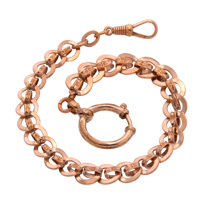 Die Kette ist zum Befestigen der Taschenuhr an einem Knopfloch, Gürtelschlaufe, an der Weste o.Ä. gedacht.
