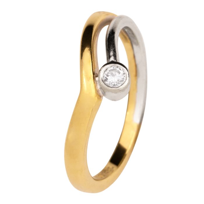 Der eine Teil ist weißgold gehalten. Mittig ist er durch einen kleinen Brillanten in Zargenfassung wieder zusammengeführt.