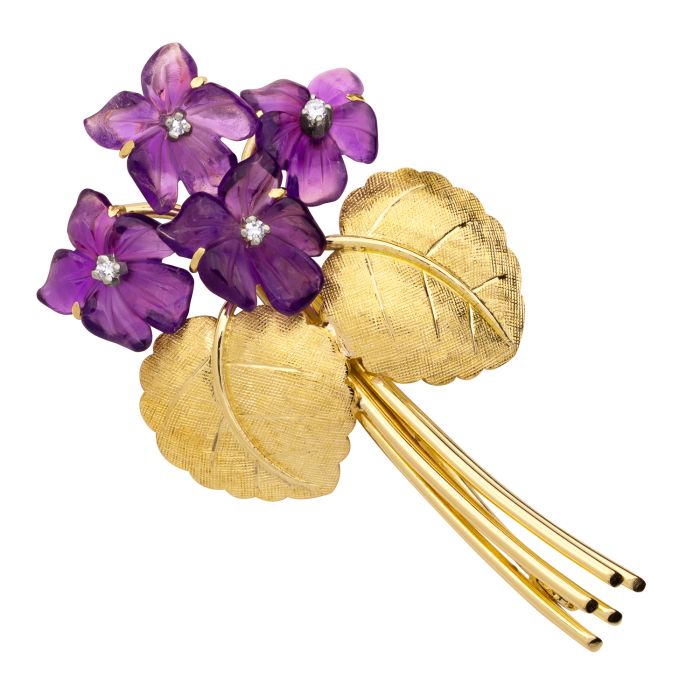 Vintage Brosche um 1960 in 14-karätigem Gelbgold in Form eines liebevoll gebundenen Veilchenstraußes.