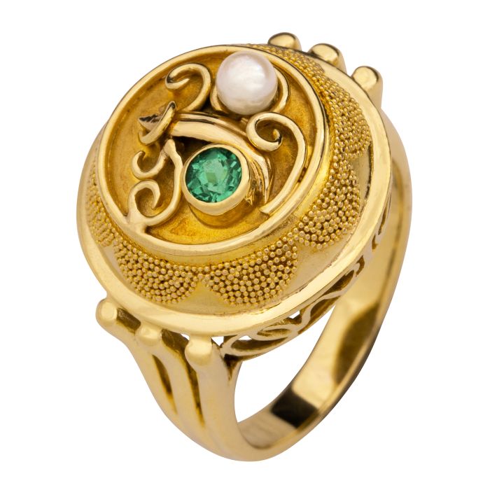Die schlichte Ringschiene teilt sich zum hohen Ringkopf hin. Der runde Ringkopf hat hübsche Granulationen aufgearbeitet.