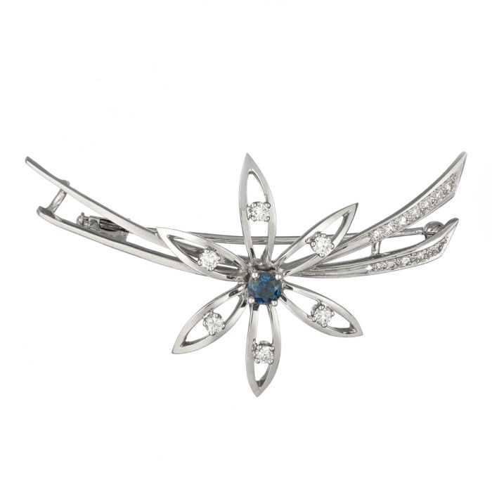 Mittig mit einer Blüte, welche mit Brillanten und einem Saphir besetzt ist.