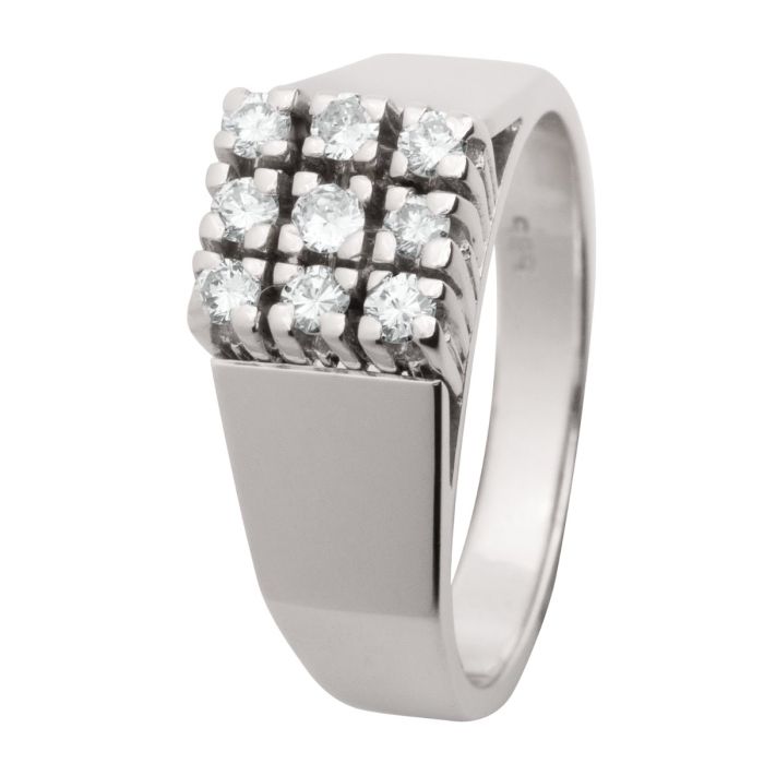 Das Schmuckstück in klarer Formensprache hat eine massive Vierkantringschiene im Verlauf und breiter abgesetzter Ringschulter.