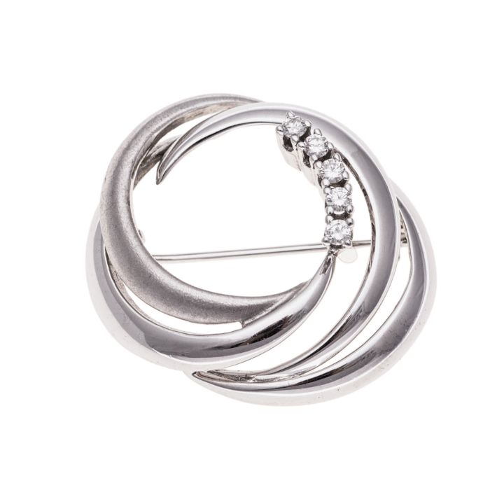 Wunderschöne Brosche mit geschwungenen Linien aus 14-karätigem Weißgold mit 5 Brillanten in jeweils einer Krappenfassung.