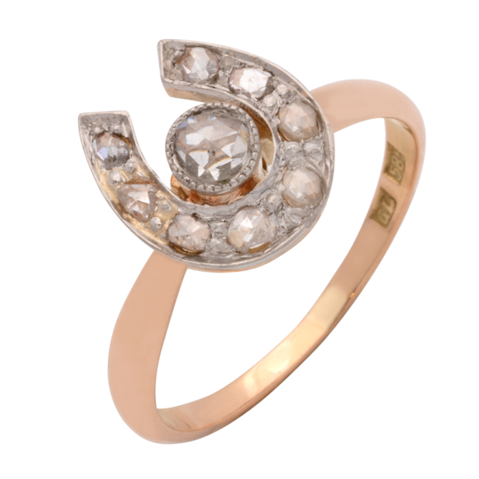 Der antike Damenring ,wohl um 1890/1900, in 585er Roségold hat als Ringkopf ein aus Platin gefertigtes Hufeisen.