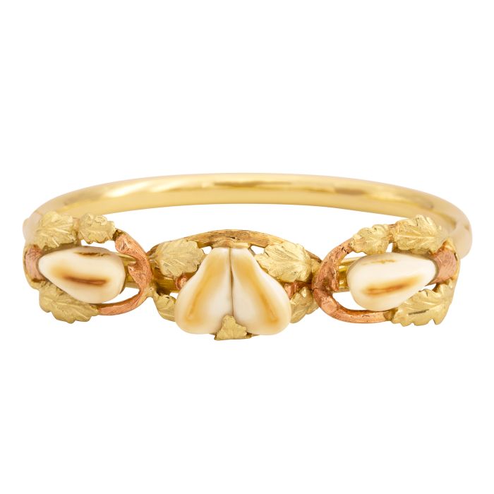 Gefasste Grandeln sind umgeben von detailgetreu gearbeitetem Eichenlaub, welche in grünlich schimmerndem Gold glänzen. Die Hülsen der Baumfrüchte sind in Rotgold gehalten.