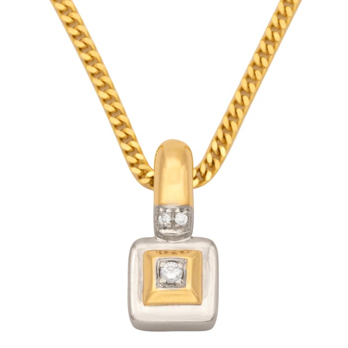 Ein eleganter, geradliniger Anhänger, ebenfalls in 8-karätigem Gold, hat eine Öse mit einem quadratischen, weißgoldenen Hauptelement, das 3 Brillanten fasst.