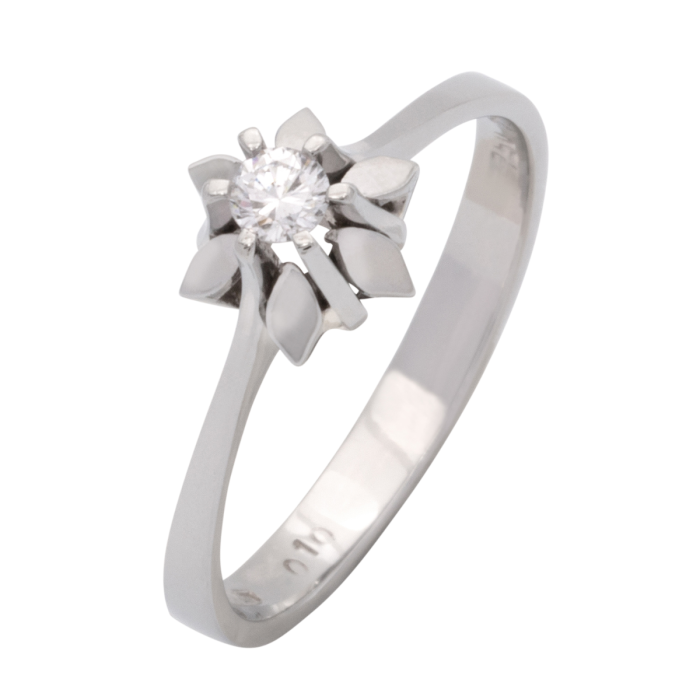 Der Brillant ,von 0,10ct thront in einer Krappenfassung. Die kleinen Zwischenelemente wirken wie Blütenblätter, daher sieht es von oben gesehen wie eine Blume aus.